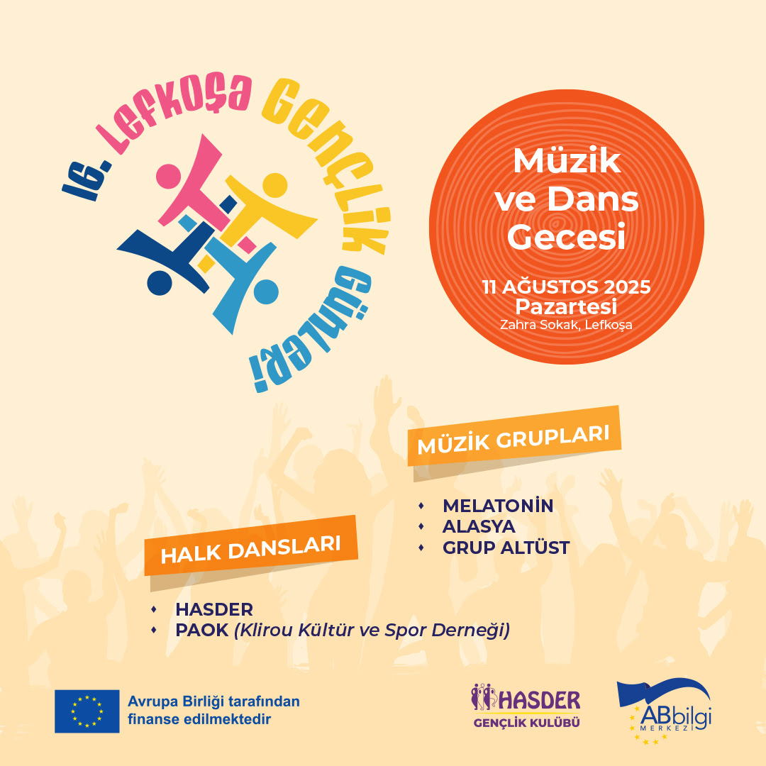 Halk Sanatları Derneği (HASDER) Gençlik Kulübü’nün, Avrupa Birliği (AB) Bilgi Merkezi katkılarıyla düzenlediği 16.Lefkoşa Gençlik Günleri kapsamında 11 Ağustos Pazartesi akşamı Zahra Sokak’ta müzik ve dans gecesi yapılacak.