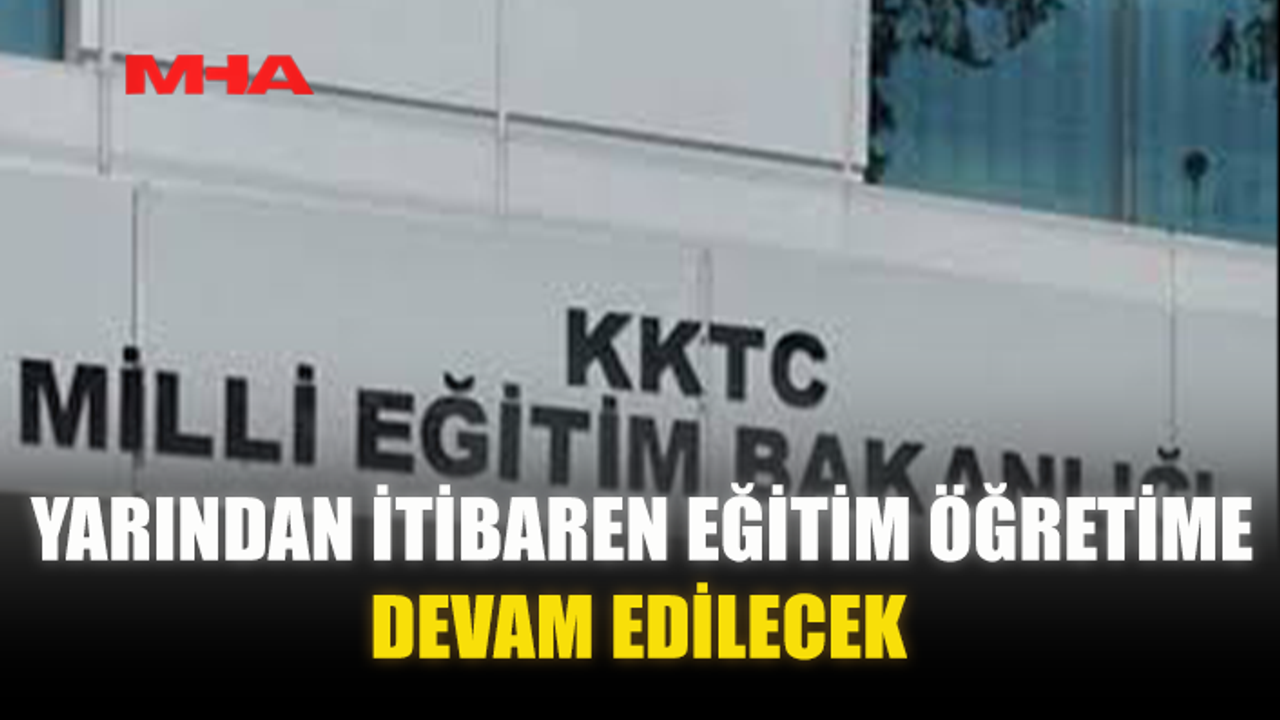 Bakanlıktan yapılan açıklamaya göre, Meteoroloji Dairesi’nden alınan son değerlendirmelere göre yarın hava parçalı ve çok bulutlu, yer yer yağmurlu olacağından yarından itibaren eğitim öğretime devam edilecek.